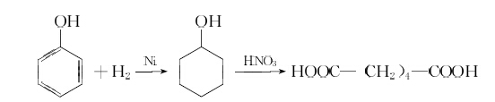 苯酚法是以苯酚為原料,用雷尼鎳作催化劑,在140?150°C 和2?3MPa 壓力下,加氫生成環(huán)己醇,然后用60%?65 %濃度的硝酸,在銅或釩催化劑存在下,在55?60°C 氧化成己二酸。反應式如下: