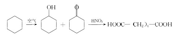 環(huán)己烷法是以環(huán)己烷為原料,在環(huán)烷酸鉆或硼酸催化劑存在下,通入空氣加壓液相氧化,生成環(huán)己酮和環(huán)己醇的混合物,再用60%濃度的硝酸在45?60°C 氧化成己二酸。反應式如下: