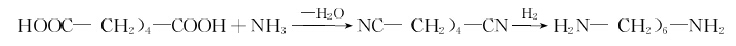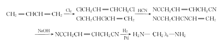 丁二烯法是先使丁二烯氯化生成二氯丁烯異構(gòu)體混合物,再與氫氰酸或氰化鈉在酸性水溶液中氰化成丁烯二氰異構(gòu)體,然后用氫氧化鈉處理,使異構(gòu)體全部轉(zhuǎn)化成1,4-二氰基丁烯-2,精制后用鈀炭作催化劑,在300°C 下氫化成己二胺。反應式如下:
