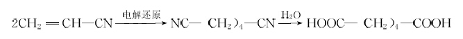 丙烯腈二聚法是以丙烯腈為原料,用電解還原法二聚生成己二腈,然后在稀硫酸水溶液中加熱水解得到己二酸。反應式如下: